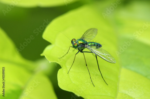© Mau Horng, Fototapeta premium Close up of a long legged fly stand on green leaf.