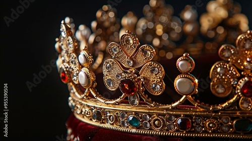 Obraz premium Close-Up of a Luxurious Golden Crown Adorned with Precious Gems and Intricate...