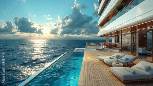 Fototapeta premium Close-Up of a Luxury Cruise Ship Deck with Loungers, Swimming Pool, and Ocean Views Digital Photography