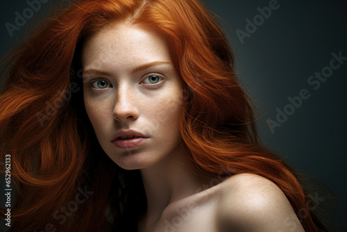 Obraz premium Close up of a Luxury portrait of a beautiful woman with Red hair and a black background.