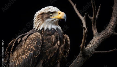 © Teuku, Obraz premium Close-up of a majestic bald eagle against a dark background.