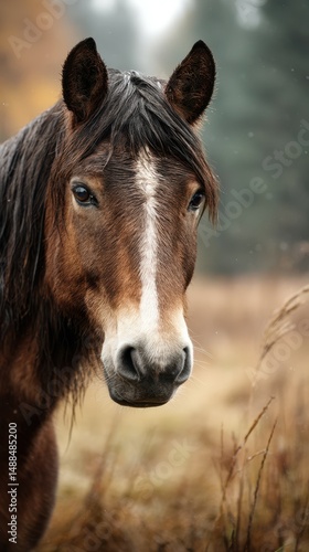© Michael, Naklejka premium Close-up of a majestic brown horse with a white blaze standing in a serene autumn landscape surrounded by tall grasses