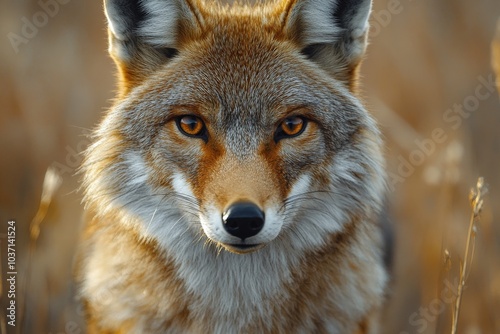 Fototapeta premium Close-up of a majestic coyote in a golden grass field, showcasing its intense...