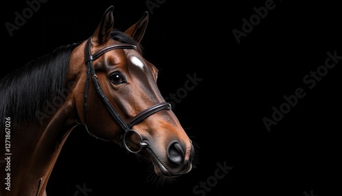 Obraz premium Close-up of a majestic horse's head against a dark background, showcasing its...