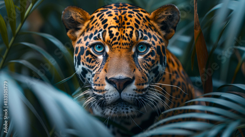 Obraz premium Close-up of a majestic leopard with piercing blue eyes, surrounded by lush...