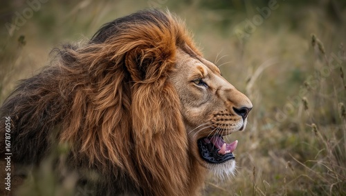 © Palmesrk, Obraz premium Close-up of a majestic lion shaking water droplets off its mane in a natural grassland ecosystem