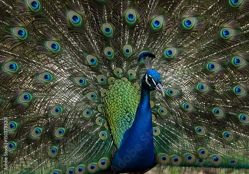 © AdityaGM, Obraz premium Close-up of a Majestic Peacock with Displayed Tail Feathers. Generative Ai