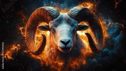 Naklejka premium Close-up of a majestic ram with large curved horns surrounded by fiery orange and blue cosmic clouds, evoking a powerful and mystical atmosphere