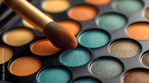 © kirania, Naklejka premium Close-up of a makeup eyeshadow palette with various colors.