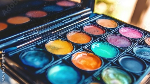 © Muhammad, Naklejka premium Close-up of a makeup palette with various colors. Palette is black, contains circular compartments filled with colorful pigments, and a makeup brush is visible.