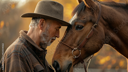 Fototapeta premium Close-up of a man and his horse, their heads close together, sharing a moment of connection