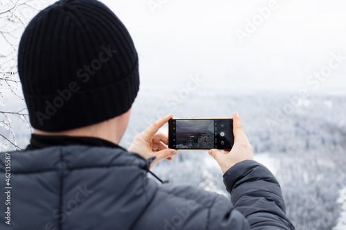 Obraz premium Close-up of a man photographing a winter landscape on the phone. Mobile...