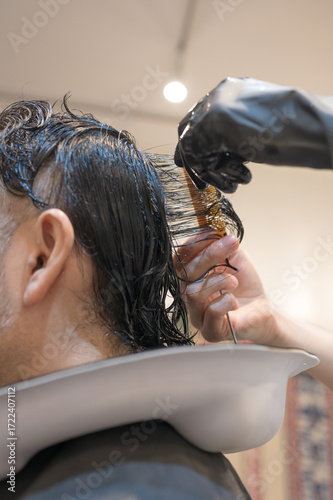 © kapinon, Naklejka premium Close-up of a man's hands as he performs a perm treatment at a hair salon