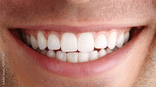 © Sariyono, Obraz premium Close up of a man's smile showing healthy white teeth. Concept of dental care, oral hygiene, and cosmetic dentistry.