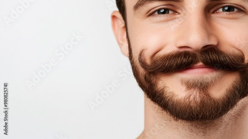 © fotogurme, Obraz premium Close-up of a man with a bold handlebar mustache smiling against a white background with text space