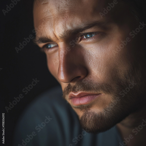 © Svetlanamax, Obraz premium Close-up of a man with a piercing gaze and a serious expression.