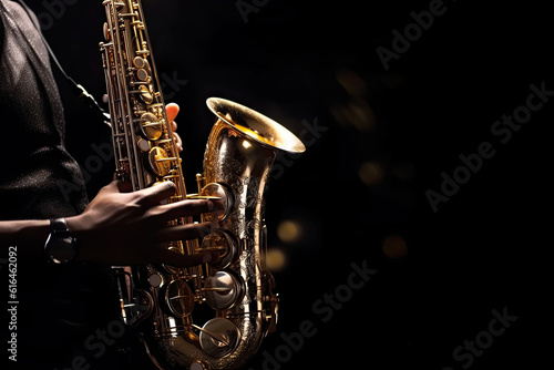 © PixMarket, Obraz premium Close-up of a man with saxophone on dark background, Generative AI