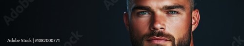 © BrandwayArt, Fototapeta premium Close-up of a man with striking blue eyes and beard against dark background