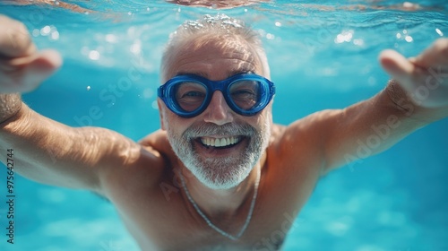 © Ahmed, Naklejka premium Close-up of a mature man playfully swimming underwater in a swimming pool. He is smiling towards the camera with his hands and arms pointing forward. He is wearing bright blue swimming goggles