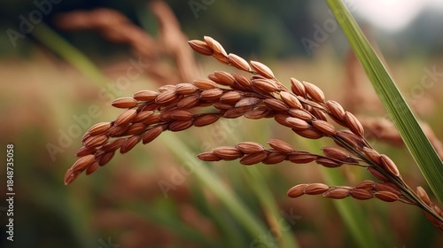 Naklejka premium Close up of a mature rice stalk with brown grains ready for harvest in a...