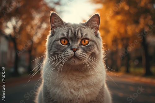 © The 2R Artificiality, Fototapeta premium Close-up of a mature Scottish fold cat with bright orange eyes sitting on a road surrounded by fall foliage