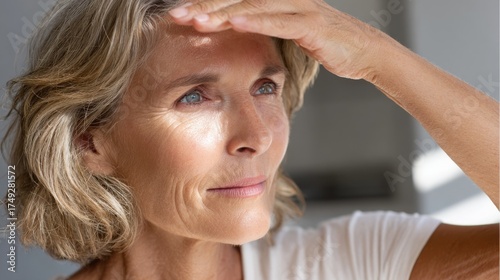 © Netsai, Naklejka premium Close-up of a mature woman shielding her eyes from the bright sunlight, looking hopefully upwards.