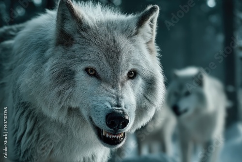 © twilight mist, Obraz premium Close-up of a menacing arctic wolf in a snowy forest.