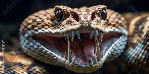 Obraz premium Close-up of a Menacing Rattlesnake Displaying Fangs with Venom Dripping, Symbolizing Danger and Wild Nature