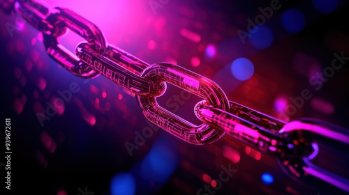 Fototapeta premium Close-up of a metal chain link illuminated with vibrant pink and purple...