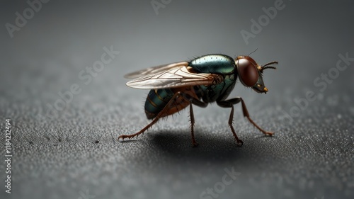 © titik, Obraz premium Close-up of a metallic green fly on a dark surface.