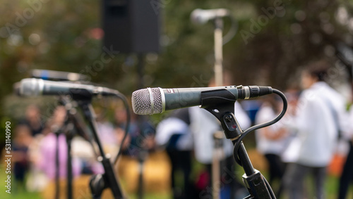 Obraz premium Close-up of a microphone on a tripod for the performance of musicians and...