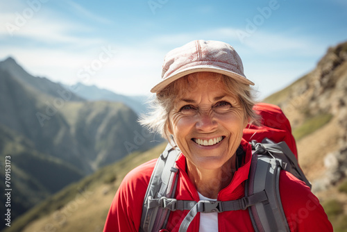 © Alicia, Fototapeta premium Close-up of a mid aged woman hiking in the mountains during summer. Landscape hiking shot. Hiking advertisement and hiking vacation tourism concept