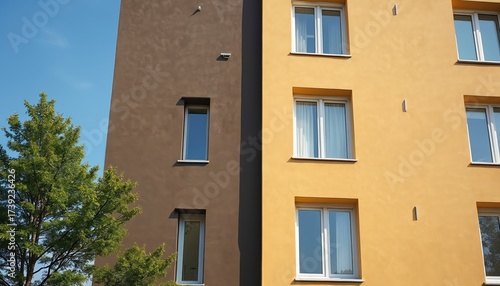 © miss irine, Fototapeta premium Close-up of a modern apartment building with yellow and brown facade. Building has multiple windows and white window frames. Tree in front of building on a sunny day with blue sky.