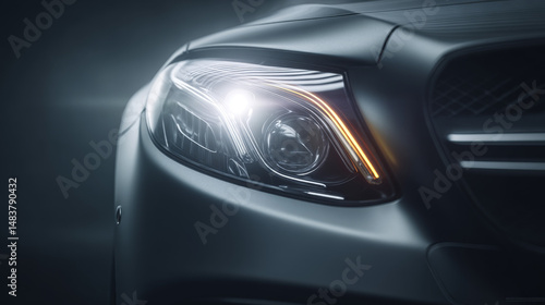 Fototapeta premium Close-up of a modern car headlight glowing in the darkness, showcasing sleek...