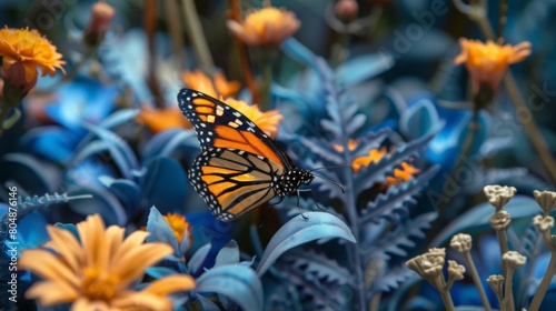 Fototapeta premium Close-up of a Monarch butterfly in a whimsical fairy garden, its wings contrasting beautifully against blue foliage and bright flowers