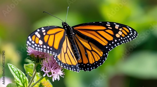 Fototapeta premium Close-up of a monarch butterfly perched on a flower in a field, with its...