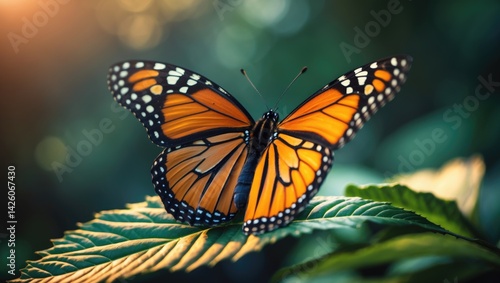 © VirtualVista, Fototapeta premium Close-up of a Monarch butterfly resting on a leaf's pattern