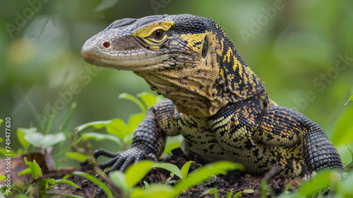 Fototapeta premium Close-up of a monitor lizard among green leaves, showcasing its detailed...