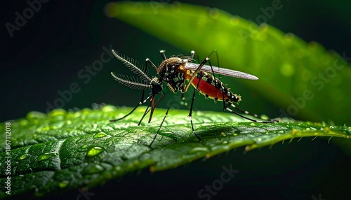 Fototapeta premium Close-up of a mosquito on a green leaf, showcasing its intricate details and...