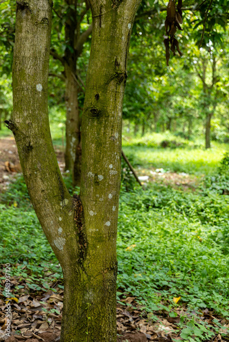 Fototapeta premium Close-up of a mossy tree trunk in a lush green forest.