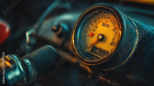 Fototapeta premium Close-up of a motorcycle speedometer illuminated at dusk displaying high speeds in a vibrant setting