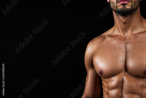 © Pixels Hunter, Naklejka premium Close-up of a muscular male chest and abs with a dark background.