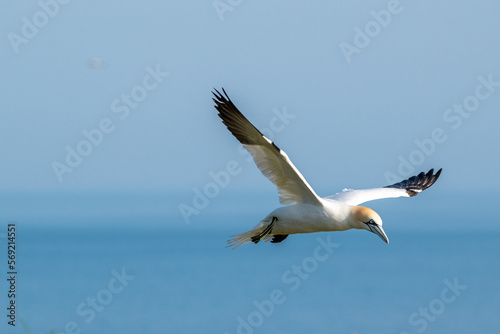 Fototapeta premium Close up of a northern gannet flying in blue skies over the sea and Bempton Cliffs at nature reserve in east Yorkshire, UK