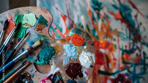 Fototapeta premium Close-up of a paint-smeared artist’s palette with vibrant red, teal, orange, and yellow hues. Scattered brushes and blurred background of an abstract painting evoke