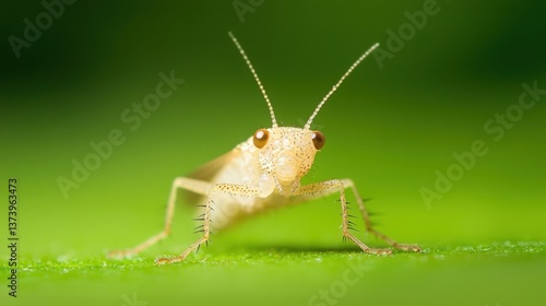 © Pica Be, Fototapeta premium Close up of a Pale Grasshopper, Tiny grasshopper on a green leaf