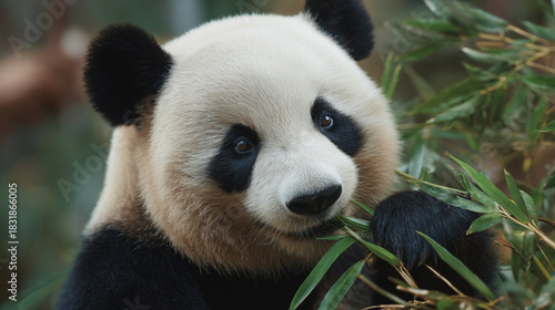 Fototapeta premium Close up of a panda bear eating bamboo leaves with a blurred background in...