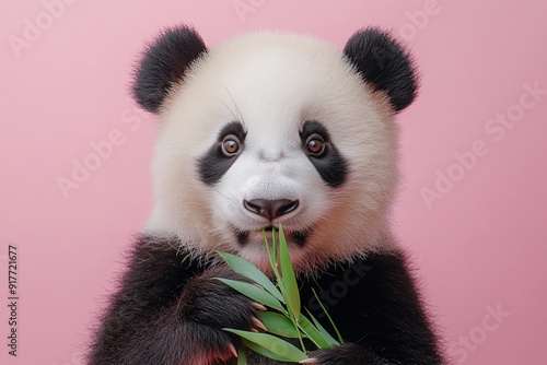 Fototapeta premium Close-up of a panda eating bamboo against a pink background.