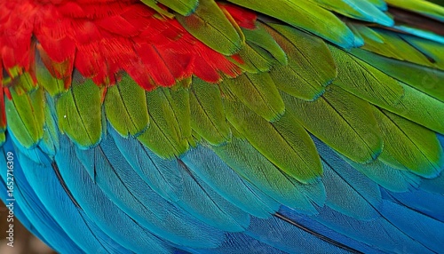 © XZIG IOVANS PRATAMA , Obraz premium Close-up of a parrot's colorful plumage, showcasing a stunning gradient of brilliant red, lush green, and serene blue feathers, highlighting their intricate texture and natural beauty