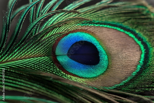 © manusha, Naklejka premium Close up of a peacock feather. Colorful decorative design.