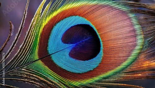 © blackdiamond67, Naklejka premium Close-up of a peacock feather's eye with vibrant iridescent colors.